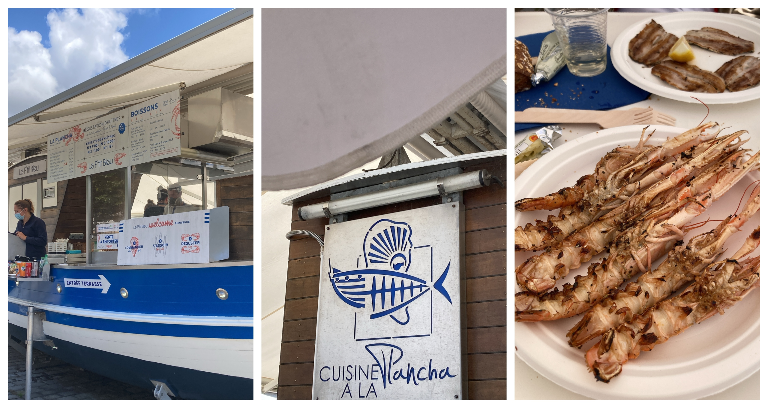 Nous sommes passés devant cette ancienne chaloupe dressée sur le port, pile à côté des tours de la Rochelle des centaines de fois en nous disant qu’il fallait tester. Chose faite le dernier midi avant de reprendre le train. Le principe : que des produits de la mer de très bonne qualité cuits à la plancha (langoustines, sardines, gambas, papillotes de moules, etc. . Vous commandez devant le bateau et vous allez vous installer sur une terrasse pile sur le port. On vous apporte votre commande dans des assiettes jetables mais c’est ça aussi qui fait le charme de cette adresse. Les gens ne s’y trompent pas car il y a pas mal de monde.