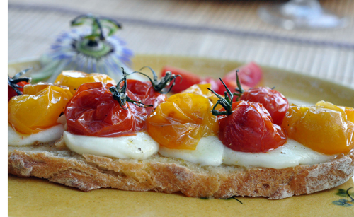 Quel délice, ces tomates cerise confites! Elles s’associent aussi très bien à une salade d’herbe et de roquette aux oignons frais sur une tartine au jambon cru grillé. Repose toi bien pendant ces quelques jours dans le Languedoc!
