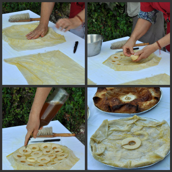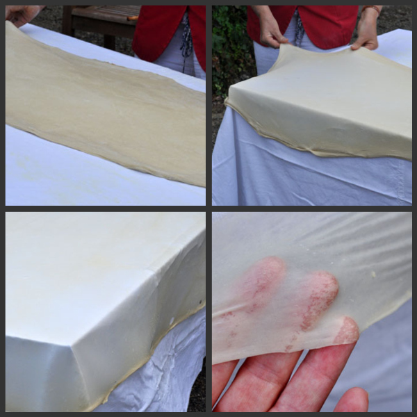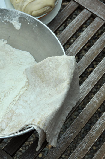 Imaginez une grande table rectangulaire recouverte d’un linge blanc. Nous sommes dehors et il commence à faire nettement moins chaud en cette journée particulièrement lourde de mi septembre. A coté de la table, un simple pâton fait avec de la farine, de l’eau et de la matière grasse (huile et beurre si j’ai bien compris).