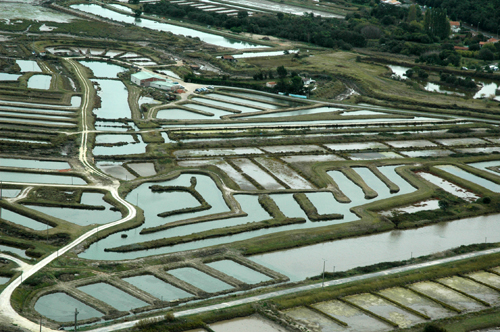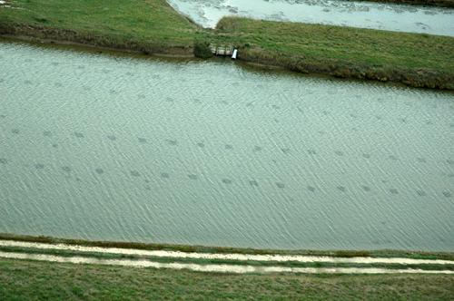 Lorsque vous survolez les claires en hélicoptère, ce que nous avons eu la chance de faire, vous pouvez apercevoir les poches dans les claires. Ce sont ces petits carrés que l’on aperçoit dans l’eau car l’eau des claires n’est pas très profonde.