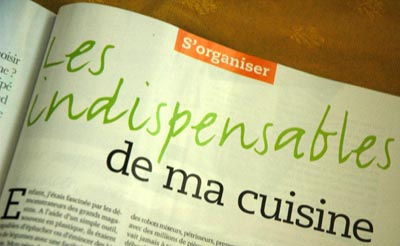 Sur ce sujet, j’ai écrit un papier de 4 pages pour le magazine Esprit Femme de février 2008, qui s’intitule « Les indispensables de ma cuisine ».