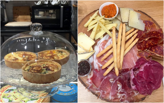 La boutique est située sur deux niveaux : l’épicerie fine/ traiteur et la cuisine au RDC et au sous sol, une salle à la jolie déco qui accueille une douzaine de personnes pour déguster planches de charcuterie et/ou fromages, tartines, quiches et desserts.