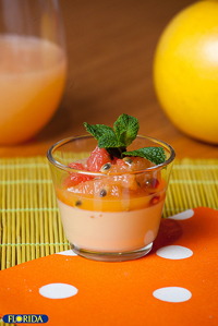 Crémeux de chocolat blanc et sa petite salade de pamplemousses, fruits de la passion et grenade