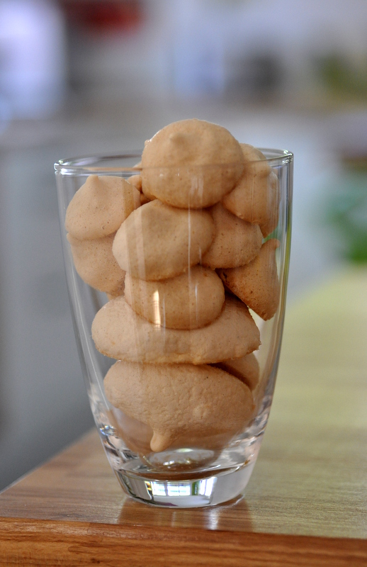 Ne soyez pas surpris par leur couleur un peu jaune, j’ai bêtement utilisé un sucre vanillé de canne assez foncé qui a légèrement coloré mes blancs d’œufs.