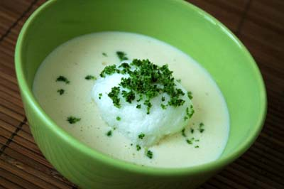 Versez la crème de pomme de terre dans un verre ou dans uu petit bol, ajoutez une boule de blancs en neige puis saupoudrez avec le brocoli râpé.
