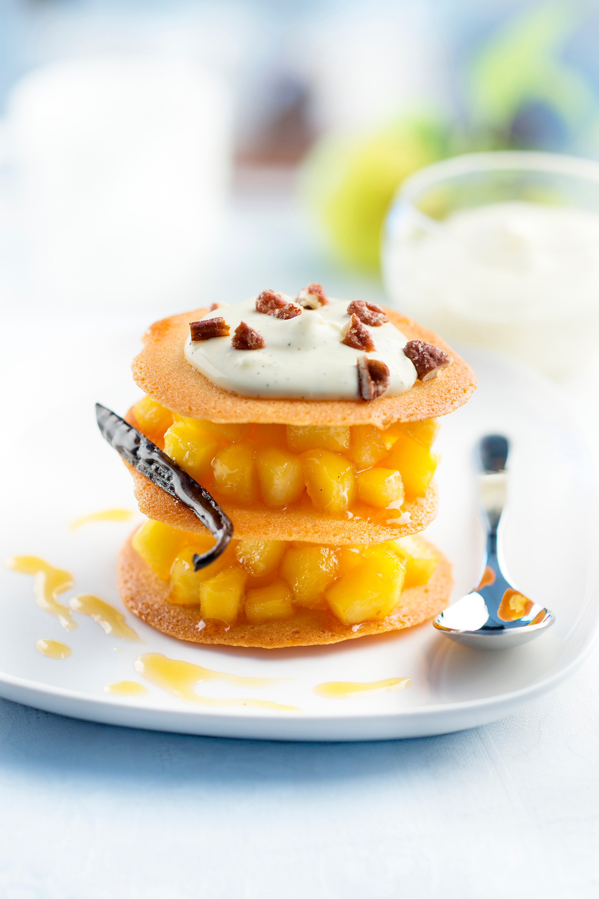Recouvrir d'une tuile, rajouter 1 grosse cuillère à soupe de fruits puis finir avec une troisième tuile. Déposer 2 c. à s. de crème à la vanille sur le dessus et quelques noix de pécan concassées.