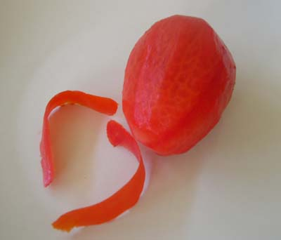 Il a raison, c’est un excellent couteau : j’ai épluché quelques tomates en moins de temps qu’il ne faut pour l’écrire et les pelures sont très fines. Il y a même un drôle de petit bec à l’extrémité du couteau qui permet d’enlever en un clin d’œil le pédoncule des tomates, là encore, sans rien gâcher de la chair.