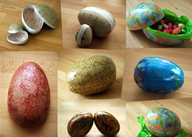 Tous les autres œufs, sauf le rose, sont décorés avec la technique du décopatch (voir note).
