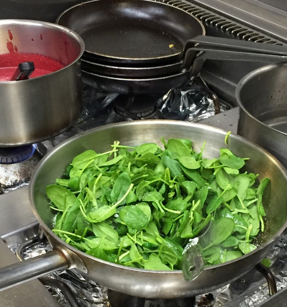 Épinards à l'ail et dans le coin en haut à gauche, la fameuse sauce "Moilee" à la betterave.