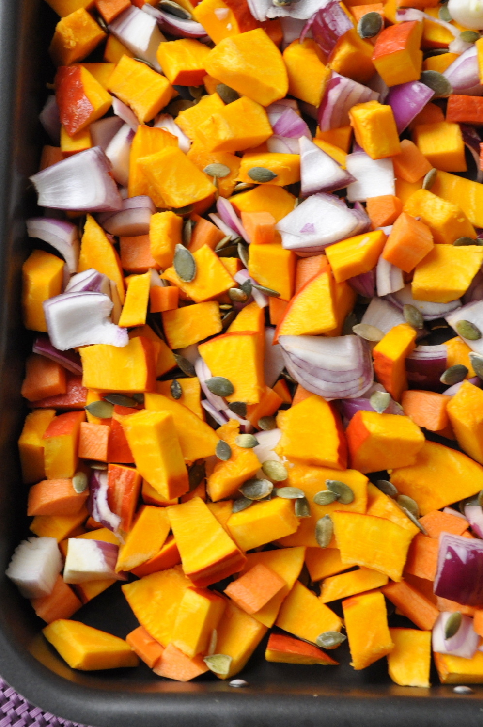 Pelez les oignons puis coupez la chair en gros morceaux. Mettez-les dans le plat avec le potimarron et les graines de courge.