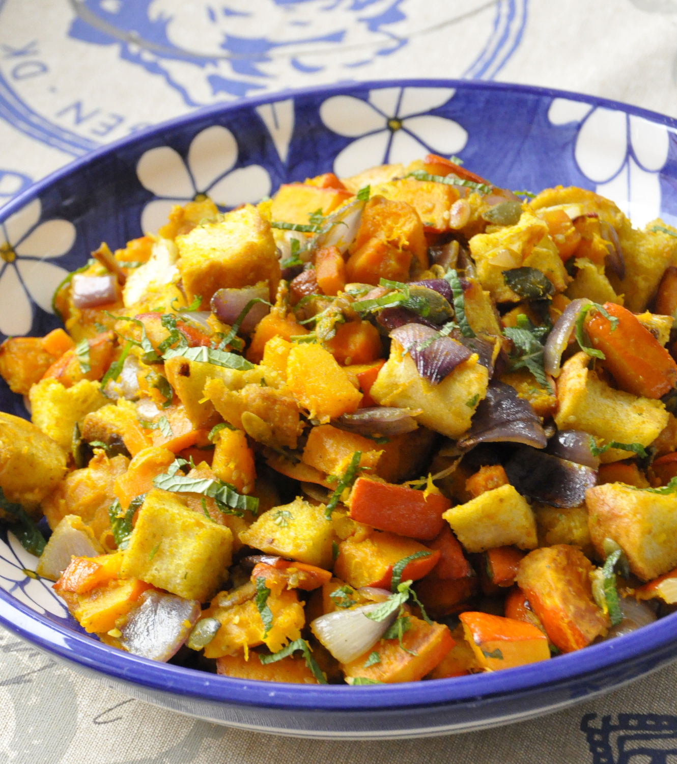 Panzanella au potimarron, carottes, oignons rouges et menthe