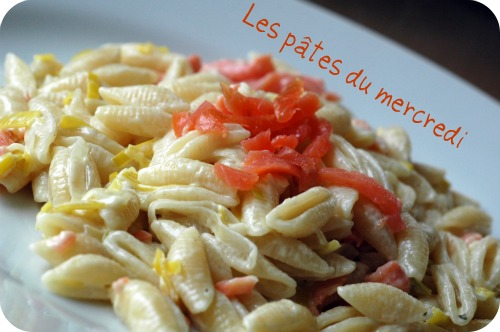 Pâtes aux poireaux, à la crème et à la truite fumée.