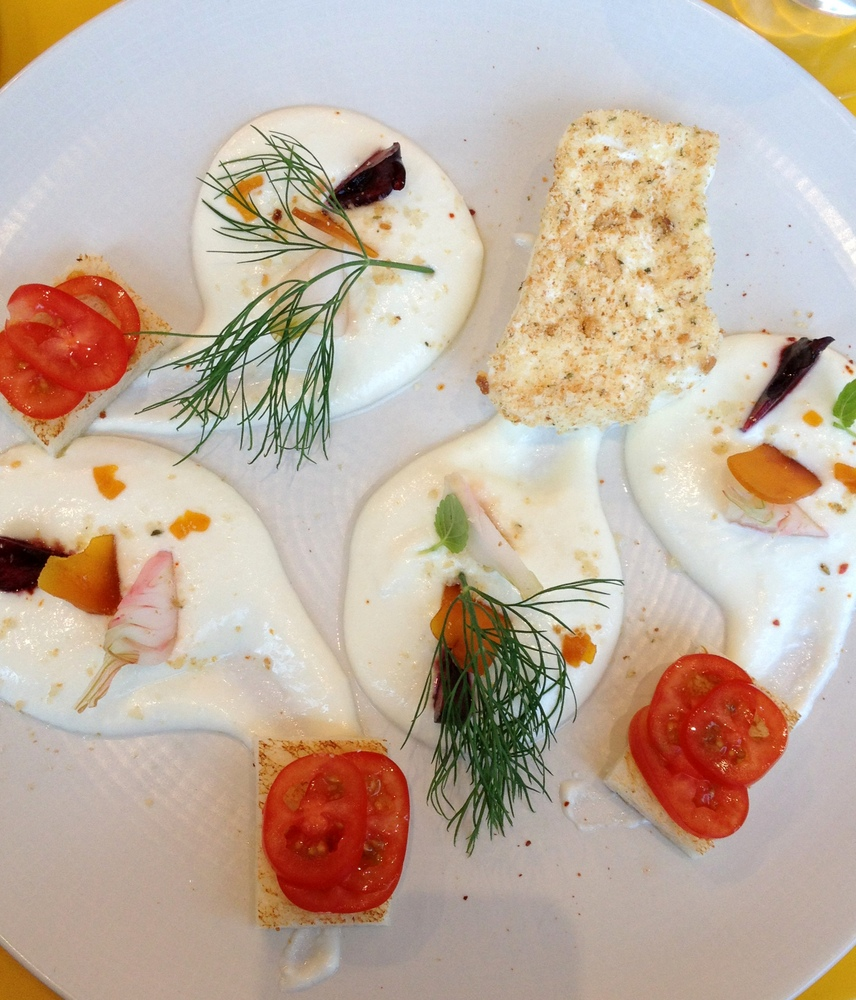 Vous pouvez y déjeuner. Philippe Conticini a convié des chefs qui cuisinent devant vous des entrées et des plats basés sur leurs souvenirs d'enfance. Ce jour-là, j'ai mangé une délicieuse salade avec une déclinaison de burrata et des copeaux de poutargue préparée par Simone Tondu et appelée « La salade Mon Sud ».