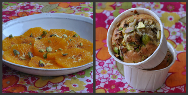 Petits moelleux pistache et salade d’oranges, épices et pistaches pour le salon du blog culinaire 2011.