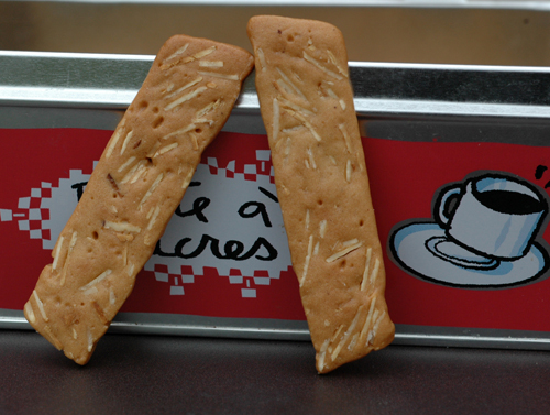 Il s’agit de biscuits très croquants et très fins avec des amandes effilées que l’on aperçoit sur la surface des sablés. Ils sont faits avec de la vergeoise brune (voir note) et sont servis traditionnellement avec le café.