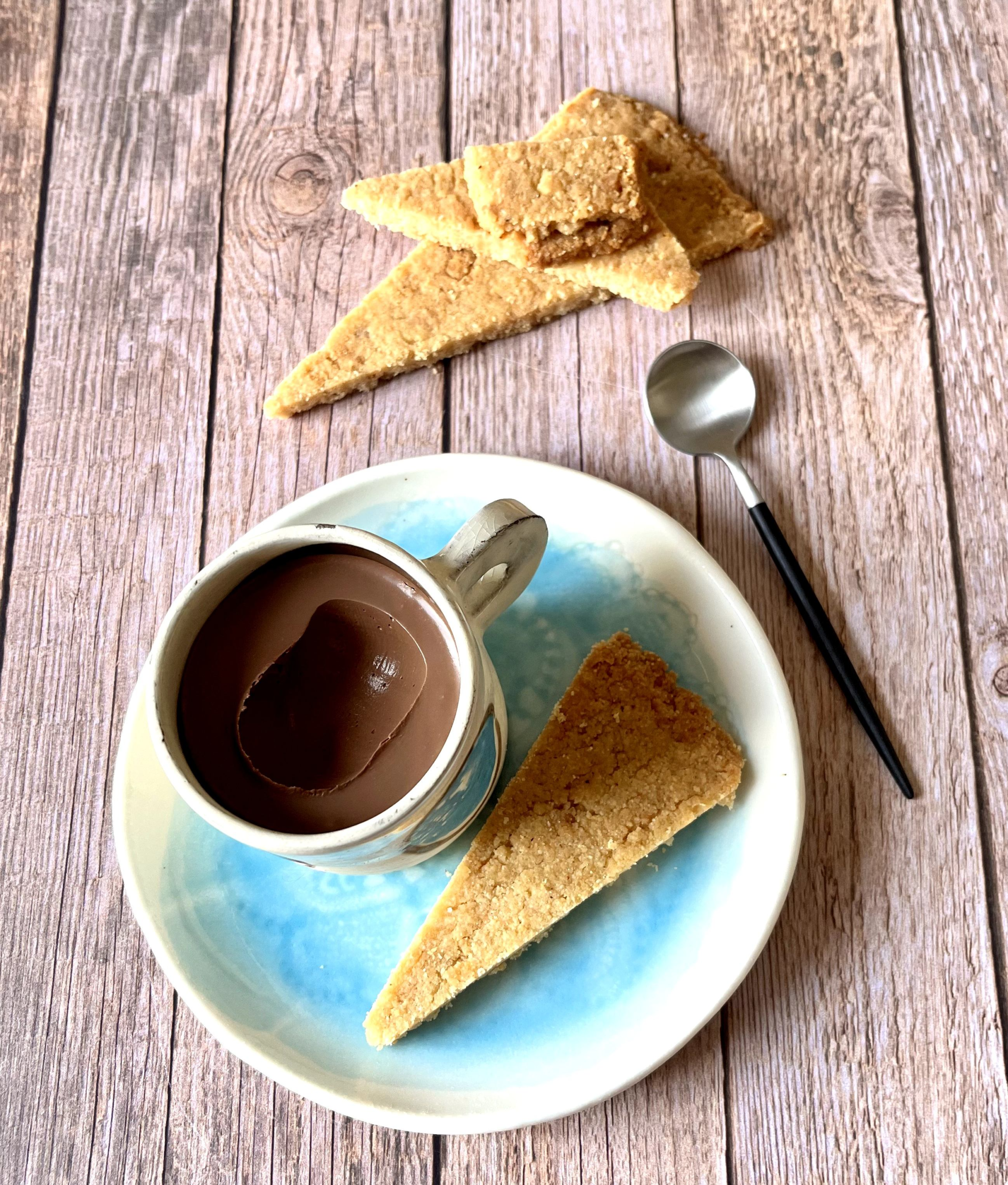 J’ai servi ces petits pots de crème avec un sablé un peu décadent. Il est cuit deux fois, il est très riche en beurre, ce qui lui donne une texture très friable qui va fondre en bouche. Il s’appelle le supra sablé et c’est une invention de Philippe Conticini. La recette du supra sablé est ici.