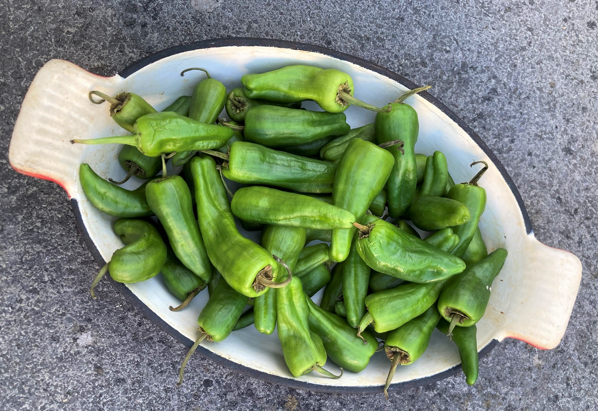 Comme nous sommes en visite chez les uns ou les autres, je ne cuisine pas du tout. Il y a quelques jours, j’ai tout de même chipé la cuisine de Roddy et de Sarah, les meilleurs amis de David. Je venais juste de dénicher des piments de Padron que j’adore et je n'ai pas pu résister à les acheter. Ce sont des piments espagnols doux que l’on trouve dans les bars en Espagne mais aussi de plus en plus en France. Ils se mangent du bout des doigts et c’est un chouette truc à servir à l’apéro.