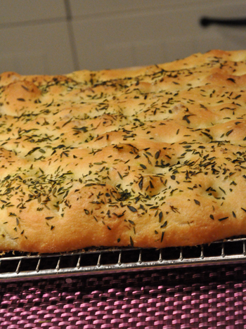Par rapport à la recette d’Edda, je n’ai rien changé à la pâte de base. J’ai juste mis moins d’huile au moment de badigeonner la pâte et j’ai remplacé l’origan que l’on met au moment d’enfourner par du thym frais. Comme je n’avais pas de bresaola, j’ai mis des tomates séchées mais les variantes sont infinies.