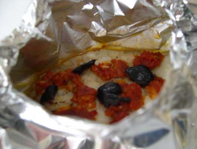 Plat minute : Papillote de turbot à la pâte de tomates séchées et olives noires.