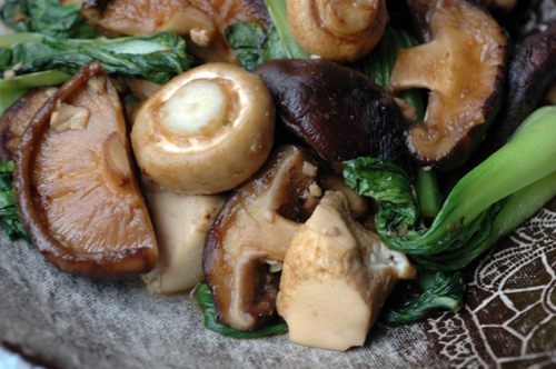 Poêlée de shiitake (shitaké, shiitakés) aux mini pak choi et tofu, sauce teriyaki