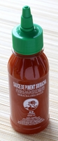 Sauce srirachaC'est cette petite bouteille rouge que l'on retrouve souvent sur les tables des restos asiatiques, un condiment composé de piments, d'ail, de vinaigre, de sel et de sucre.