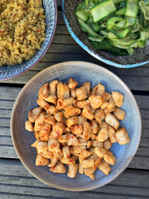 Le soir venu, j'avais encore les bras en compote mais j'ai retrouvé avec grand plaisir le chemin de la cuisine pour préparer un repas tout simple : poulet à la sauce Sriracha, du quinoa et des tagliatelles de courgettes.