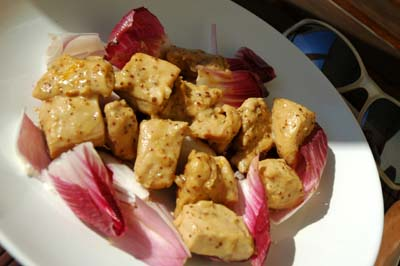 J’ai servi ce poulet hier midi pour mon amie Ingrid avec une salade aux herbes pour un repas presque léger.