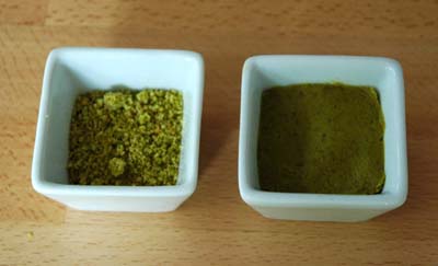 La pâte de pistache peut également se préparer en broyant des pistaches, éventuellement des amandes, du sucre et un peu d’huile, comme dans cette recette ou dans celle-ci.
