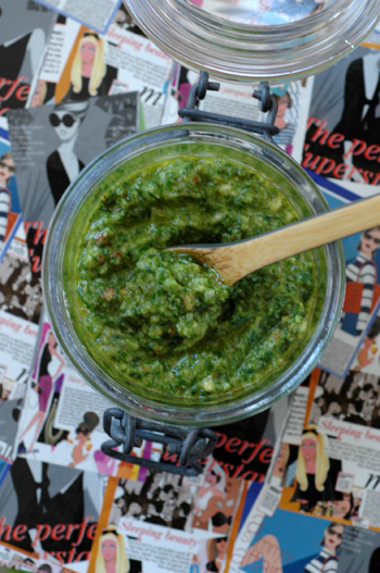 praxitelles : je mets ce pesto sur des pâtes. Nous l’avons également mis sur du saumon cuit, un délice ou sur des tartines que j’ai recouvertes d’oignons nouveaux, de radis noir coupé en très fines tranches et un oeuf poché.