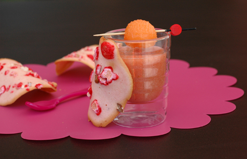 Soupe melon tuiles pralines roses
