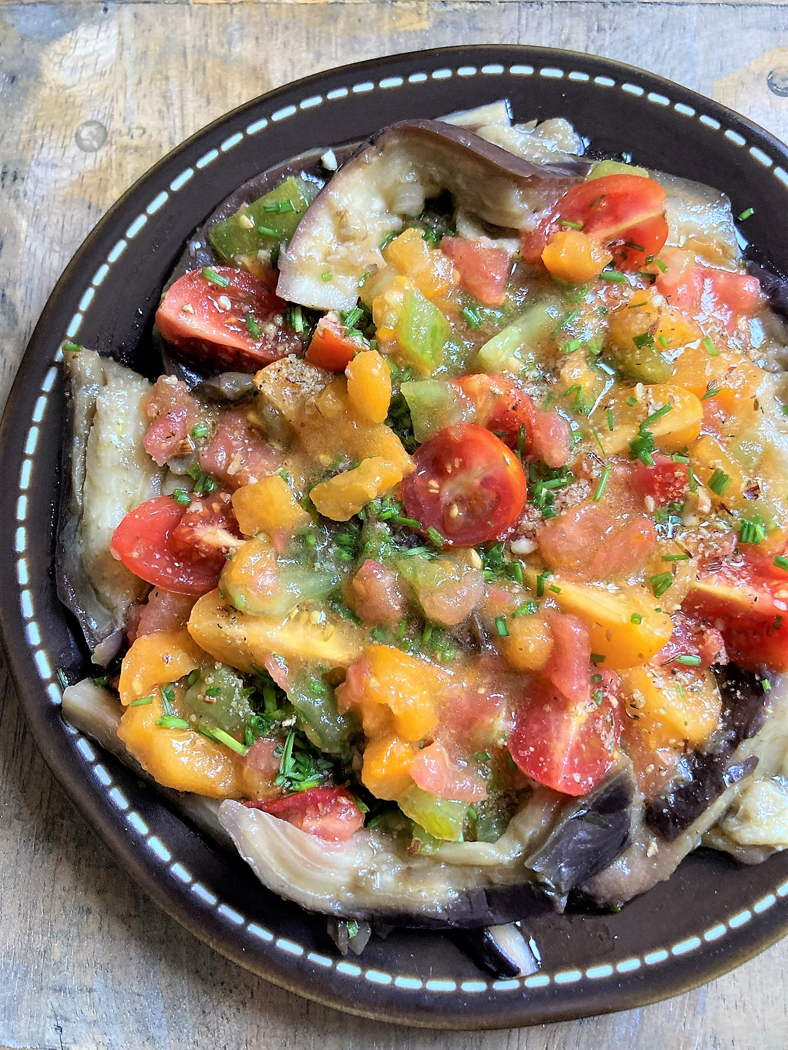 Salade d’aubergines à la vapeur et salsa de tomates