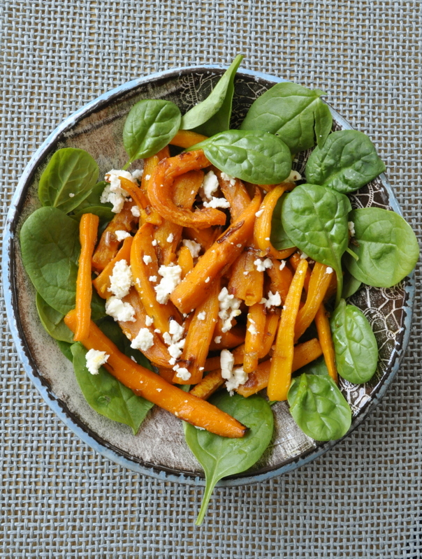 Salade de patates douces et carottes rôties , fromage de féta et pousses épinard