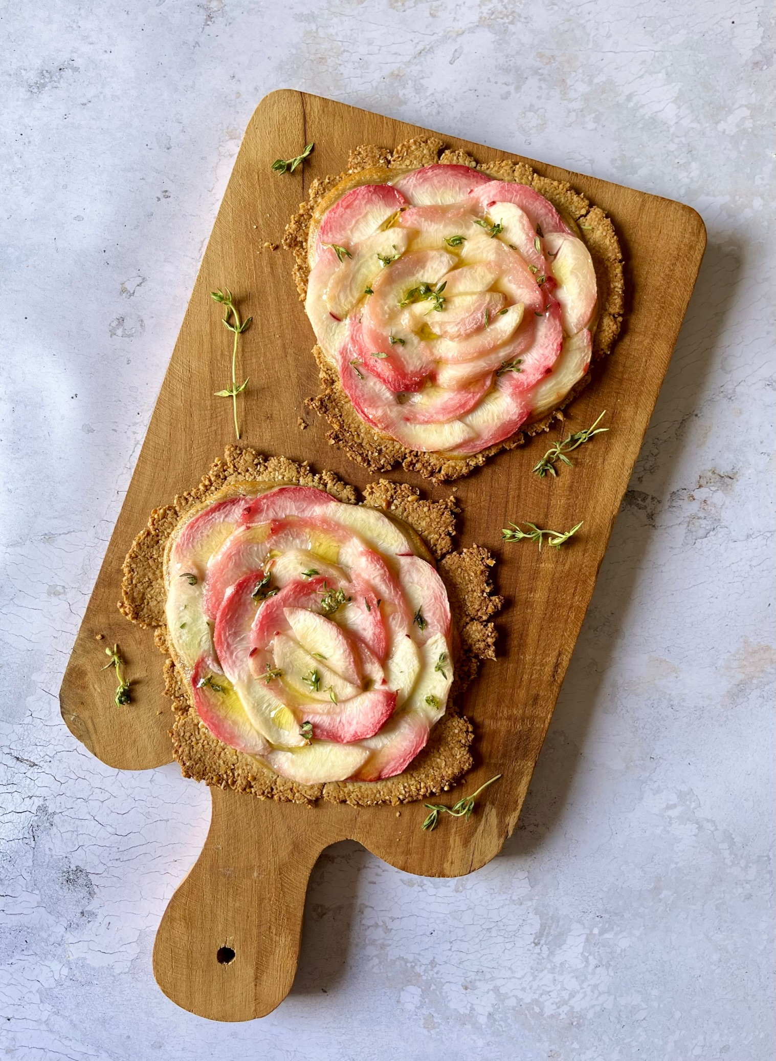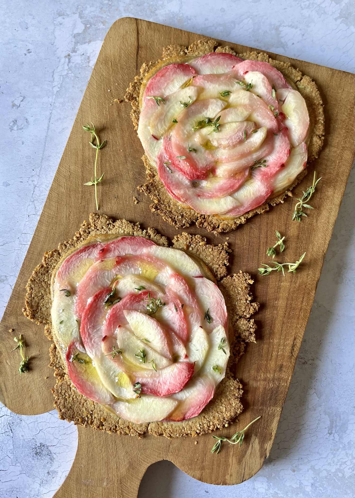 Plusieurs recettes m’ont fait de l'œil. Pour démarrer, j’ai jeté mon dévolu sur des tartelettes aux poires et j’ai remplacé les poires par des pêches. Sa recette est ultra ingénieuse et permet de se régaler, en utilisant peu de sucre et du bon gras. C’est de la vraie gourmandise raisonnée, un terme que j'emprunte à Frédéric Bau de chez Valrhona. Cette façon de faire les desserts me plaît de plus en plus.