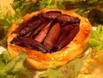 J’ai donc fait confire les échalotes comme indiqué dans la recette de Delia puis je les ai posées sur des disques de pâte feuilletée que j’ai fait cuire au four. Et voilà, c’est joli non ?