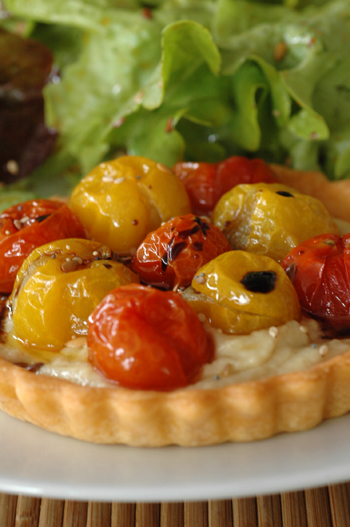 Je bénis encore ce ratage avec les courgettes car nous avons adoré ces tartelettes. Le contraste entre la crème d’artichauts assez douce mais goûteuse et les tomates est très bon.