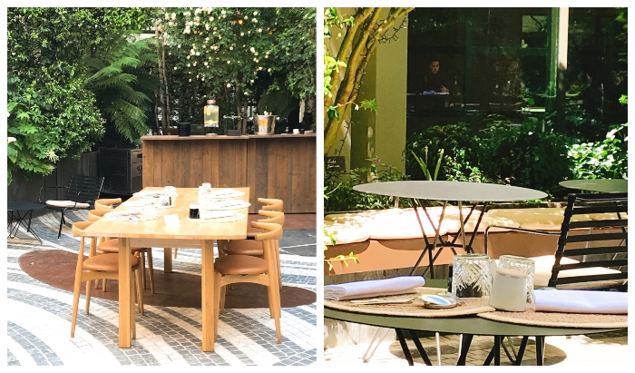 En ce premier samedi de Juin, nous voilà toutes les deux sur la terrasse joliment arborée du jardin privé du Novotel. Il fait un temps magnifique et nous profitons de ce moment hors du temps pour nous prélasser et nous régaler.