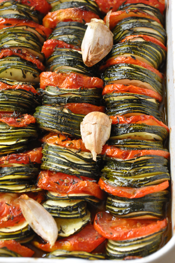 Tian courgettes et tomates, thym et ail en chemise, à ma façon