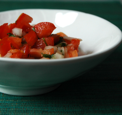 Cette recette me rappelle une salade marocaine, mais sans le piment de cayenne. On utilise du poivre à la place. C’est un peu la “chlada” (salade) de mon enfance. Et on l’a toujours appelée salade, alors qu’il n’y a pas un bout de vert ou de laitue dedans. Ma mère et ma grand-mère la préparaient toujours pour accompagner le tajine du jour ou encore les sardines mzawjine. IlDans la cuisine juive marocaine (et dans l’excellent livre du même titre), j’ai découvert qu’on l’appelait Merk hzina, littéralement la sauce triste. Je me suis toujours posé la question par rapport à cette appelation… Cette chlada est pourtant si gaie, avec ses tons rouge tomate !