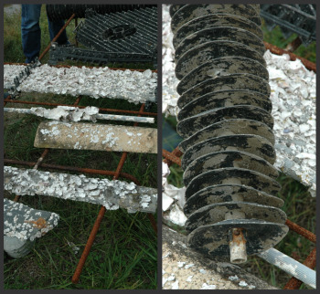 Il s’agit ensuite de capter ces larves dans un délai de 15 jours, car si elles ne s’accrochent pas sur un support, grâce à une colle qu’elles développent naturellement, elles finissent tout simplement par mourir. C’est à ce moment qu’interviennent les ostréiculteurs en posant un support pour le captage. Ce captage, pour les huitres Marennes Oléron, s’est fait sur différents supports selon les époques, comme la pierre, l’ardoise, les tuiles, les pieux d’ardoise, les pieux en plastique, les barres de fer, etc., pour arriver aujourd’hui à des pleno, sorte de carré alvéolé en plastique (tout en haut sur la photo de gauche)qui peut contenir de 5 000 à 7 000 huitres ou à des cordées de coupelles (photo de droite) qui peuvent contenir 3 000 à 4000 huitres.