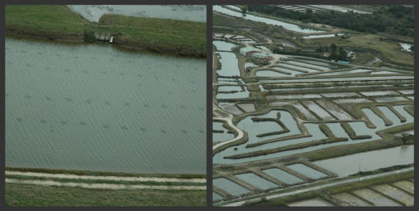 Claires vues du ciel grâce à un super tour en Hélico, les petits carrés à gauche sont les poches d'huitres déposées dans les claires pour affinage.
