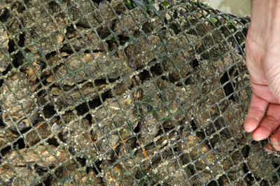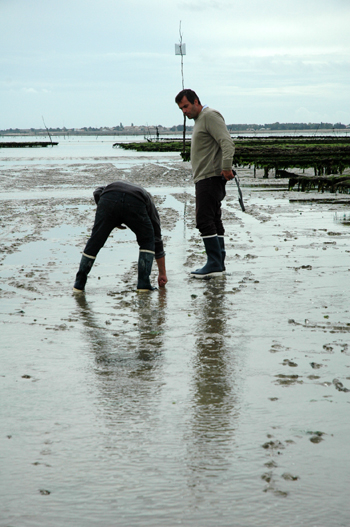 Une fois les poches posées dans les parcs à huitres, il faut les retourner régulièrement, voire les changer de poches, afin que les huitres se développent de manière harmonieuse et cela pendant 2 ans. Si ce travail n’est pas fait régulièrement, les coquilles d’huitres deviennent biscornues ou trop longues, avec éventuellement des moules ou des huitres plus jeunes qui viennent s’accrocher sur elles. C’est un sacré boulot qu’il faut faire quelque soit le temps, à marée descendante, en utilisant des bateaux à fond plat, histoire de ne pas rester bloqué dans la vase.