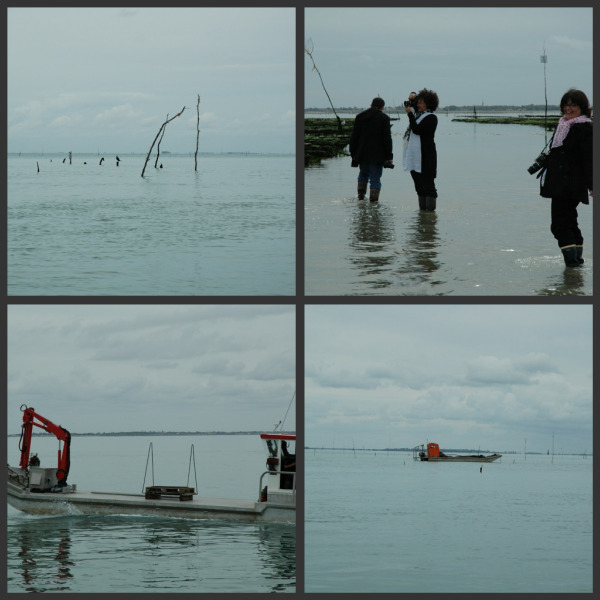 Quand vous êtes en mer et que vous voyez des piques en bois dépasser de l’eau, c’est que vous être en bordure d’un parc à huitres. Ce sont eux qui les délimitent. Nous avons eu le loisir de nous balader au cœur d’un parc à huitres, quoi que le terme balade n’est pas très approprié, c’est du sport de se promener dans la vase et il vaut mieux avoir de vraies cuissardes. J’ai trouvé ce moment magique avec une lumière très belle ce jour là. J’avais parfois l’impression que la mer et le ciel ne faisait qu’un.