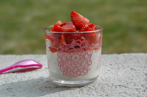 Dans ma version, pas de café, pas de tartelettes mais la crème parfumée à la vanille est simplement déposée dans des verrines et accompagnée d’une salade de fraises, ajoutée au dernier moment.