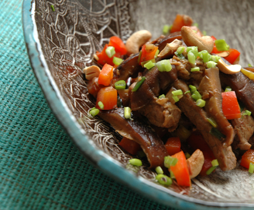 Wok d’agneau aux shiitakes (shitakés) poivrons rouges et noix de cajou